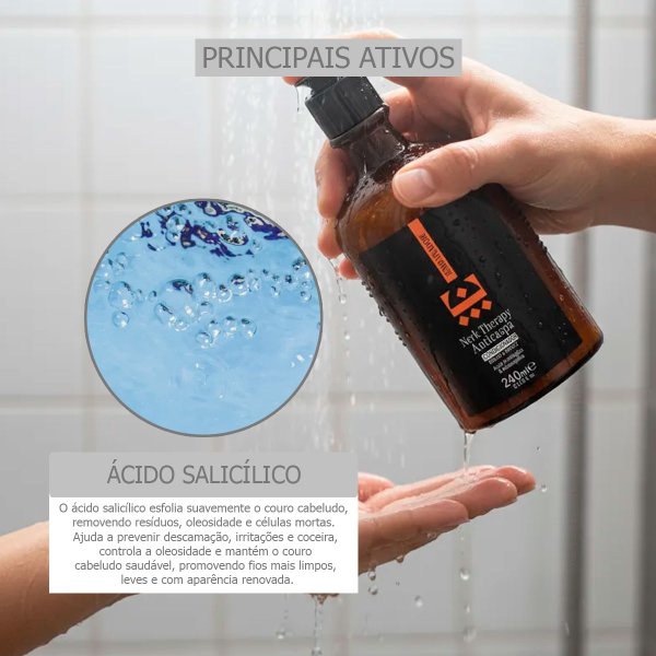O ácido salicílico ajuda a remover o excesso de oleosidade e as células mortas do couro cabeludo, prevenindo a caspa. Ele desobstrui os poros, promovendo um ambiente saudável para o crescimento capilar. Além disso, reduz a coceira e a irritação, proporcionando alívio em casos de descamação