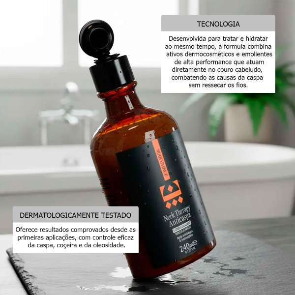 Combine o uso contínuo com o shampoo anticaspa Nerk Therapy para potencializar o controle da caspa e a hidratação dos fios. Não interrompa o uso para melhores resultados a longo prazo.